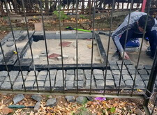 Первый этап работы – очистка и подготовка места захоронения к дальнейшим работам. Мы вынесли памятник, срезали старое ограждение, очистили землю от травы и иного мусора. Далее разметили площадь участка и укрыли её геотекстилем.