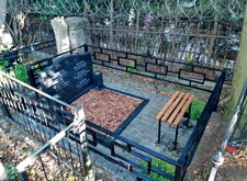 Приносим уже готовую и покрашенную оградку, устанавливаем, свариваем по месту. Параллельно с этим, по дополнительному заказу клиента, устанавливаем по обе стороны от памятника траурные урны, а напротив него – лавочку и две небольшие клумбы с можжевельниками.