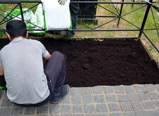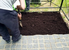 На данной могиле клиент решил высадить многолетний газон и обратился к нам за помощью. Осмотрев могилу, мы сразу же принялись за работу: первым делом насыпали на приготовленное под живые насаждения место слой новой, плодородной почвы.