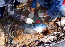 Первым делом мы приступаем к демонтажу объекта: разбираем основание, отодвигаем в сторону уцелевшие элементы надгробья.