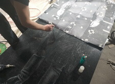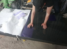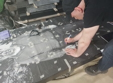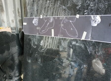 Переходим к созданию портретов на гранитной поверхности. Распечатываем ранее созданный макет, прикладываем его к плите. Под него кладём кальку, обводим ручкой основные линии портрета, убираем всю бумагу. Для проявления линий посыпаем камень тальком.