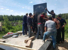 Следующий этап – один из самых ответственных в работе. Плиту, весящую порядка 600 килограмм, требовалось доставить на место захоронения. Для этого понадобились объединённые усилия более чем двадцати человек.